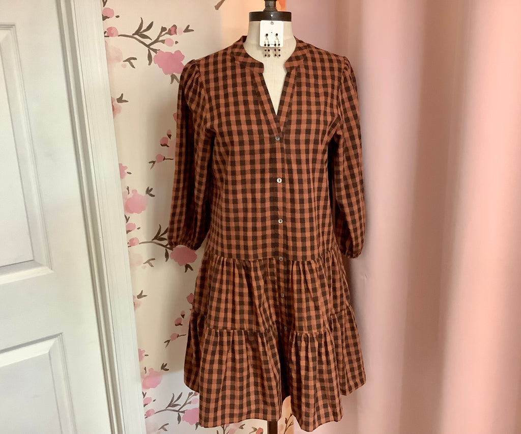 3/4 Sleeve Plaid Print Woven Tiered Dress