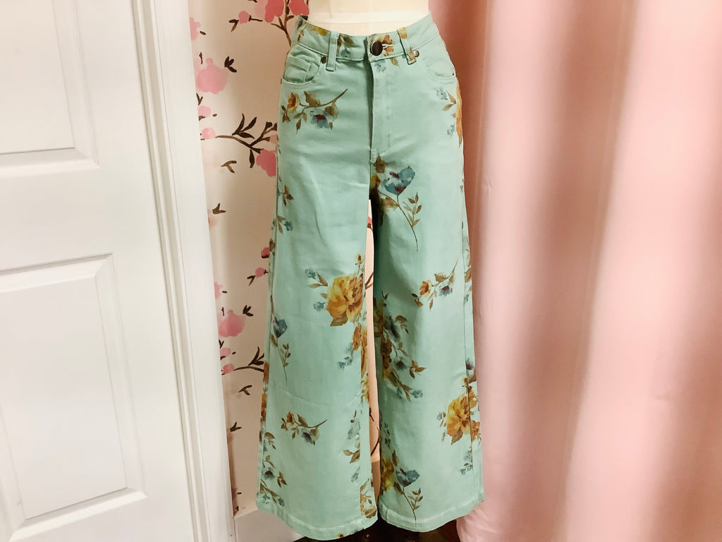 MINT FLOWER PRINT WASHED TWILL PANTS