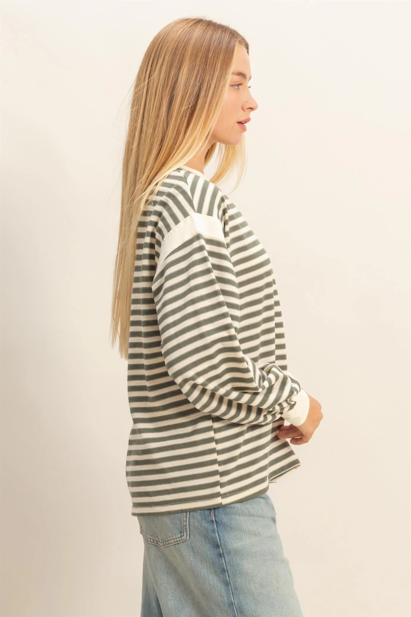 This long-sleeve top features a classic striped design, perfect for versatile styling. Its relaxed fit ensures comfort, making it ideal for layering or as a standalone piece. Pair it with jeans for a casual day out or layer under a blazer for refined style. A must-have for effortless fashion.