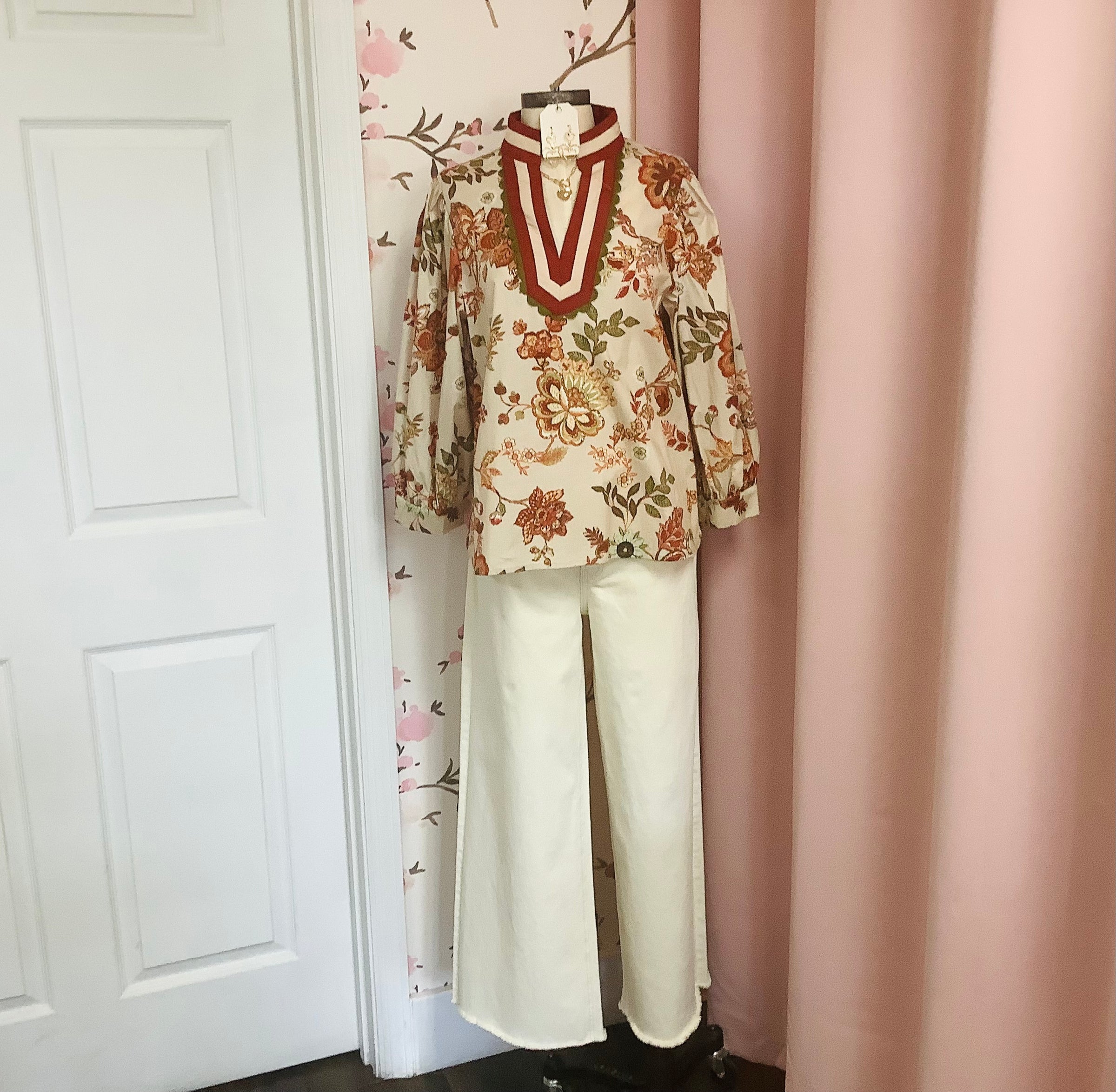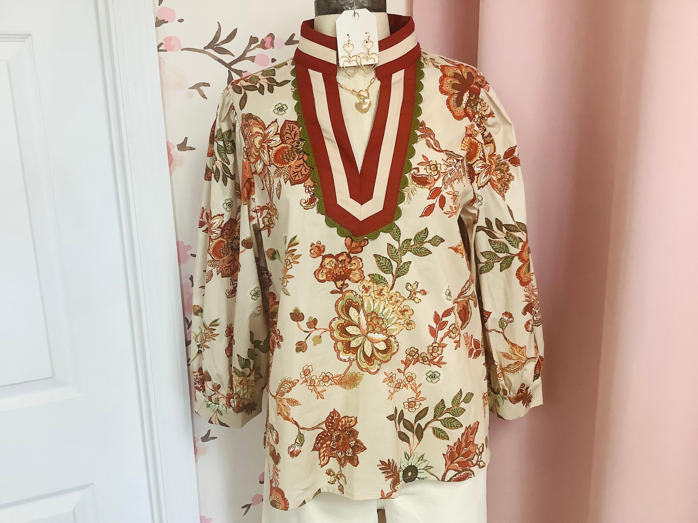 Floral print ¾ sleeve top featuring scallop accent trim V-neck. Unlined. Woven. Non-sheer. Lightweight.