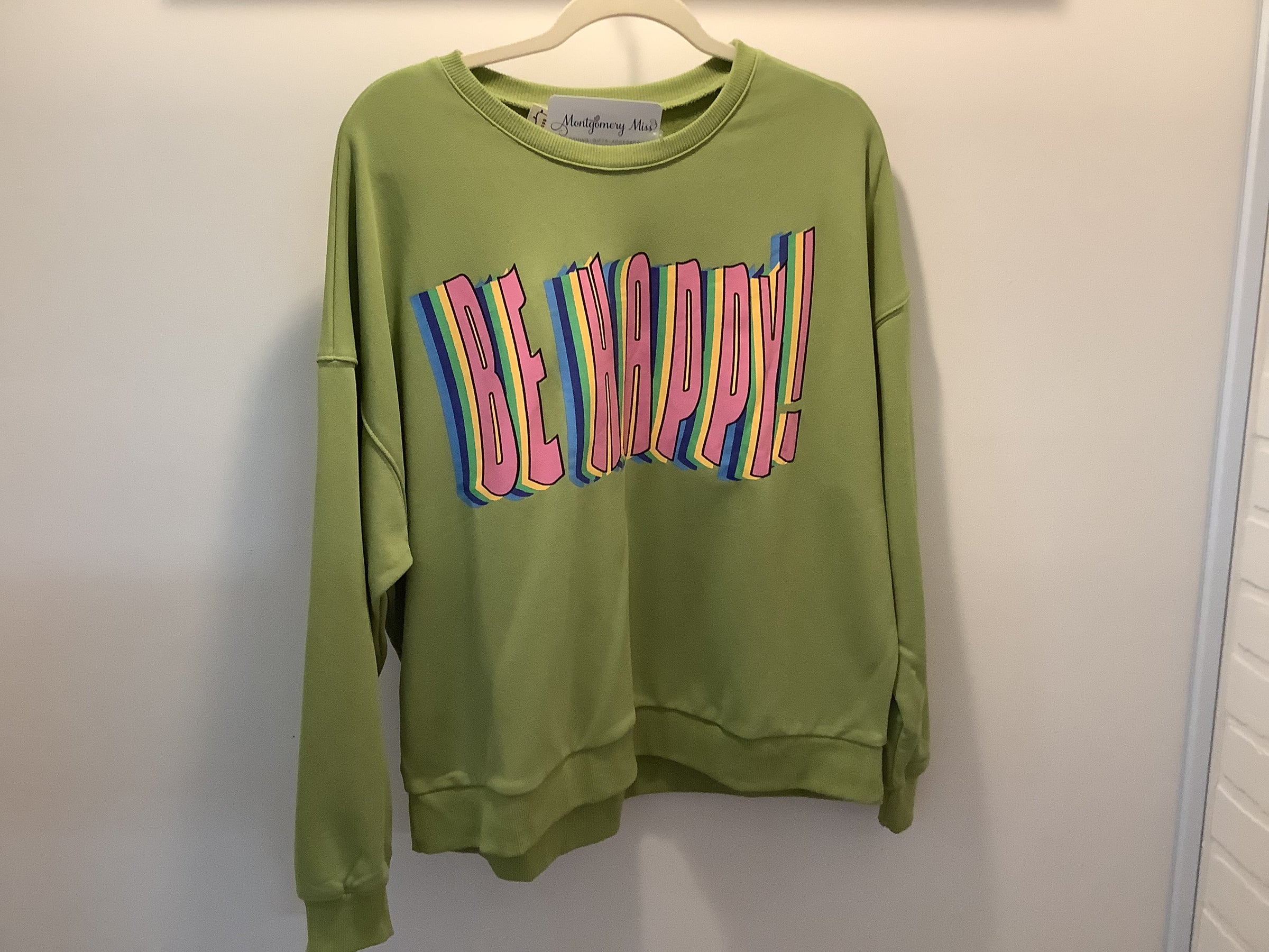 Embrace comfort and positivity with this charming matcha-colored pullover. Crafted from soft terry knit fabric, it features a cheerful "Happy" print that spreads good vibes wherever you go.