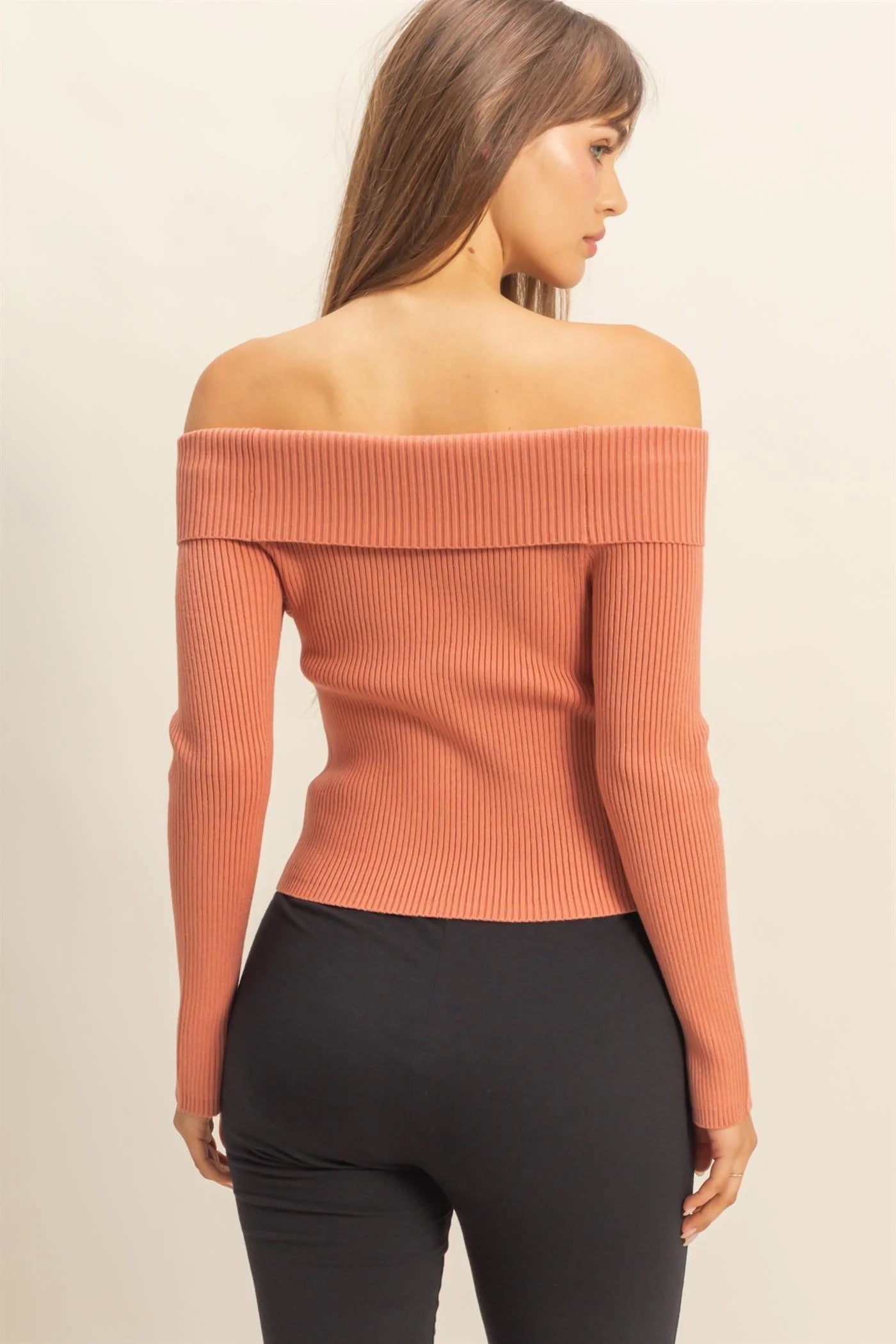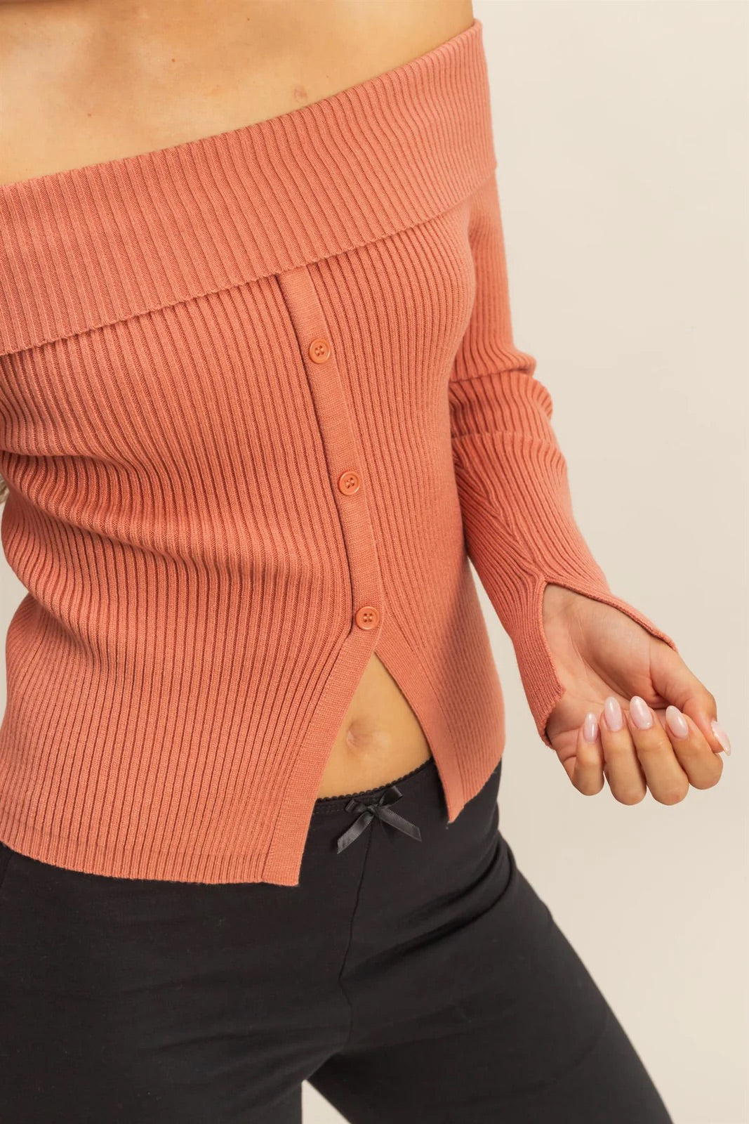 Embrace timeless elegance with this beautifully crafted rib-knit sweater, designed to elevate your wardrobe with its unique off-shoulder neckline and subtle front button details. The stretchy ribbed fabric ensures a close, flattering fit that outlines your silhouette perfectly, while the long sleeves add a classic touch to this modern piece.